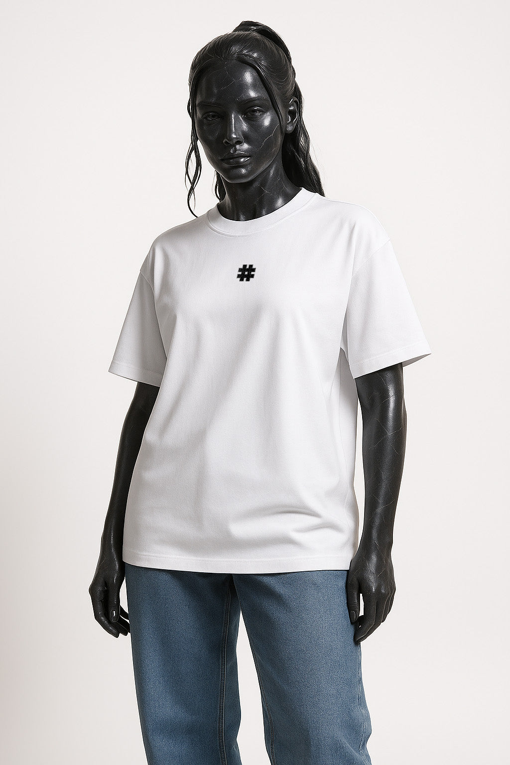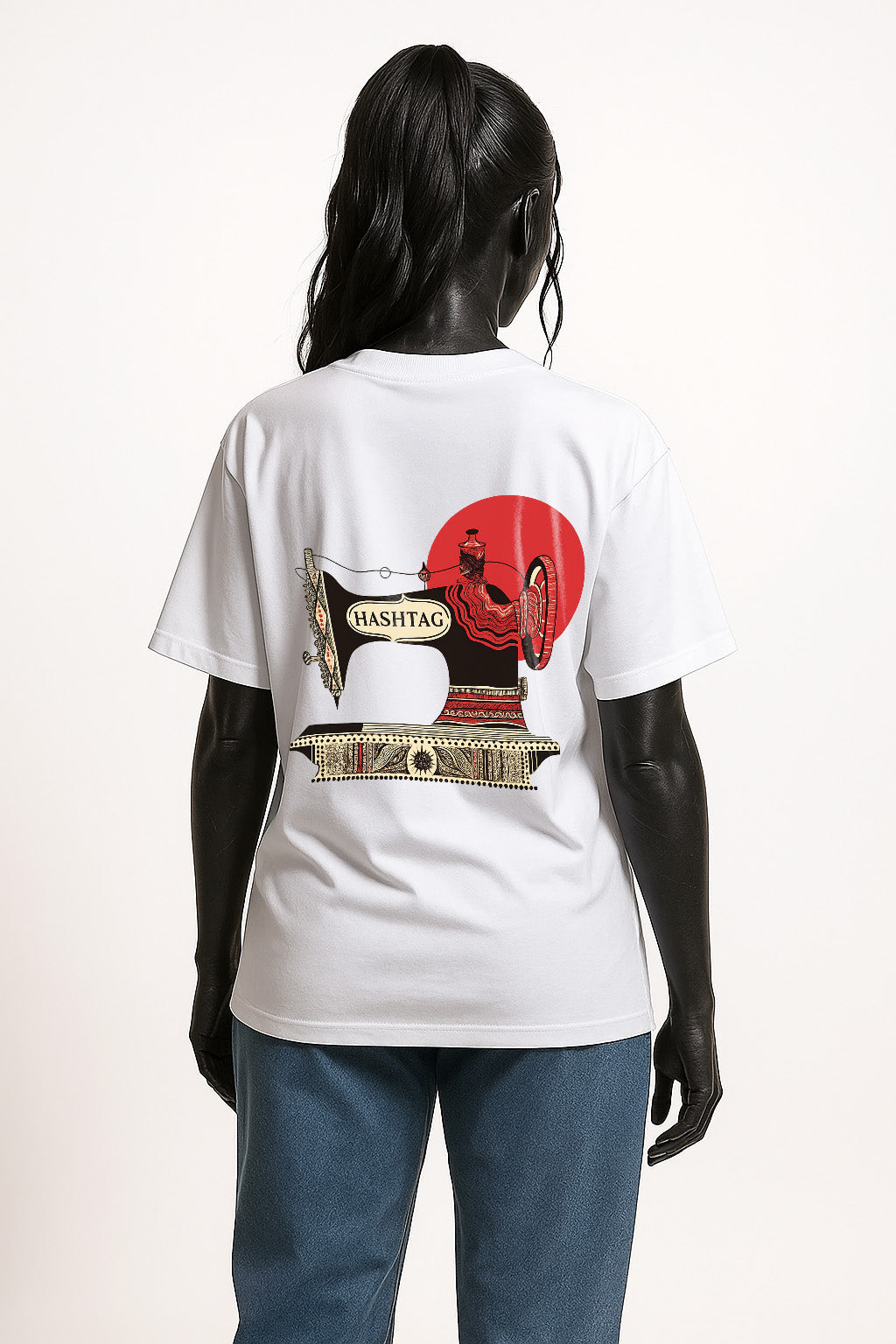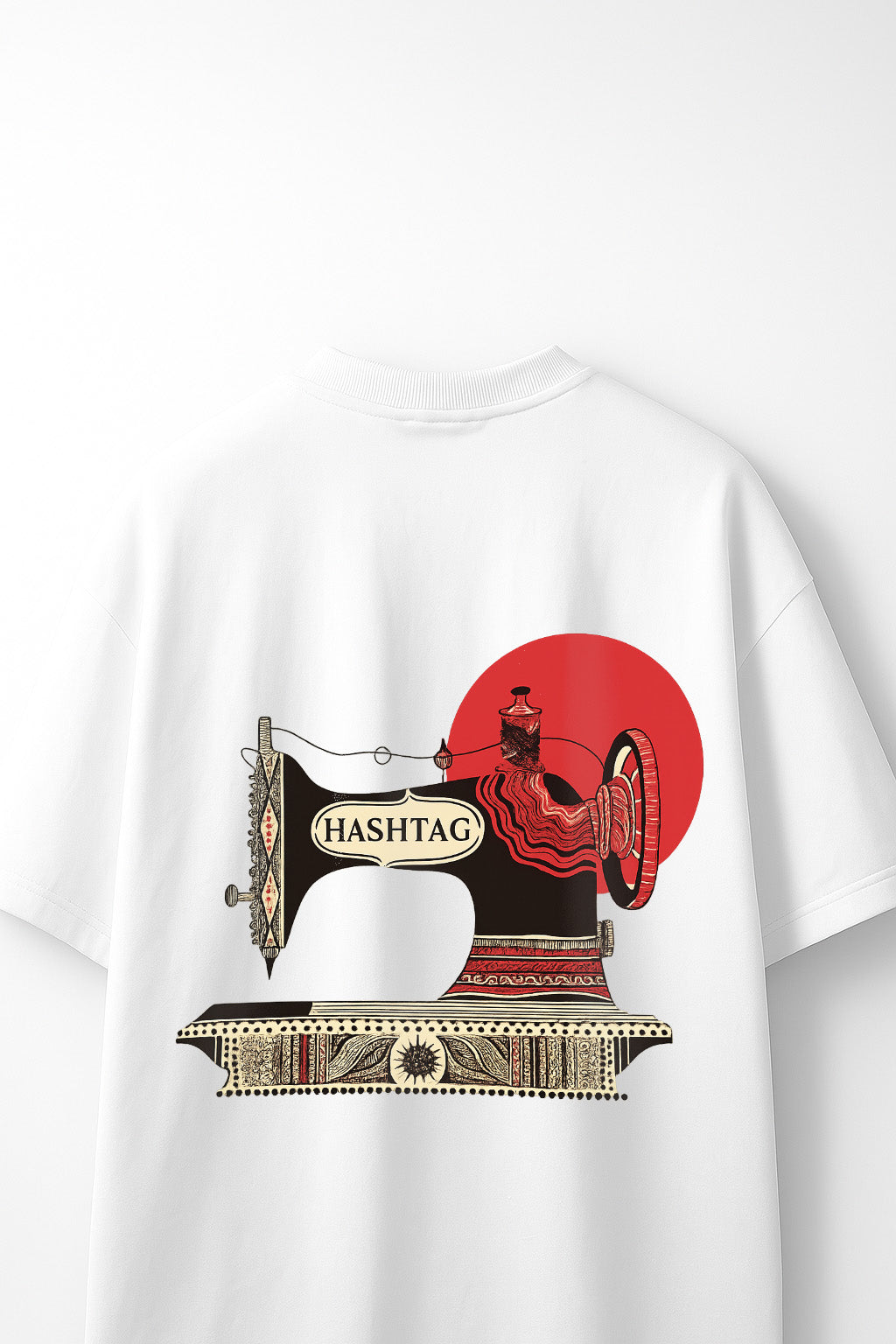 Oversized Tee is made from heavyweight 100% cotton, 240gsm. The rib-knit crewneck tee fits relaxed in the body with dropped shoulders. The back carries an illustrated sewing machine framed by a bold red sun, detailed with ornate patterns and the HASHTAG wordmark at its center, a symbol of craftsmanship and heritage. The front remains minimal with the HASHTAG icon placed at the chest.